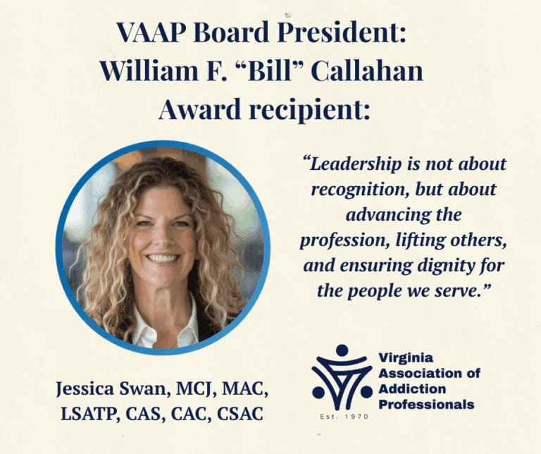 VAAP is proud and fortunate to be under Jess’s leadership, where her vision, integrity, and compassion continue to inspire our community. Please join us in congratulating her on receiving the William F. “Bill” Callahan Award, a well-deserved honor that reflects her dedication to families, professionals, and the future of addiction counseling.